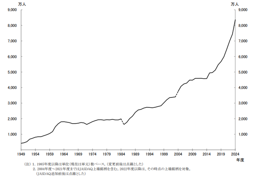2024年1月に新NISA制度が開始され、貯蓄から投資の流れが加速しています。2024年度の株主数合計(延べ人数)のうち、個人株主数(延べ人数)は前年より914万人増加して8,359万人と過去最高を更新しました。※1このような流れを受け上場企業には、株主還元の拡充やIR情報開示の強化、PBRの向上などが個人投資家から期待されています。また東証からはグロース市場の上場維持基準の引き上げや、情報提供体制(IR体制)の義務化が進められています。